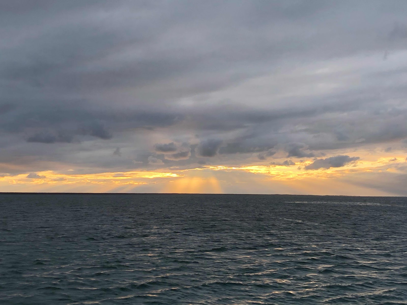6:45 am- Captain Steve hasn’t had much sleep however we have been sailing at an average of 7 knots and the seas are moderately calm. Almost the perfect sail with the lit up moon. Clouds are starting to form, and she is starting to hide once in a while.
